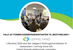 I efteråret 2025 skal der vælges 2 forbrugerkandidater til bestyrelsen i Lemvig Vand A/S. Valget foregår elektronisk i perioden 9. – 22. oktober 2025. Læs mere i denne artikel.